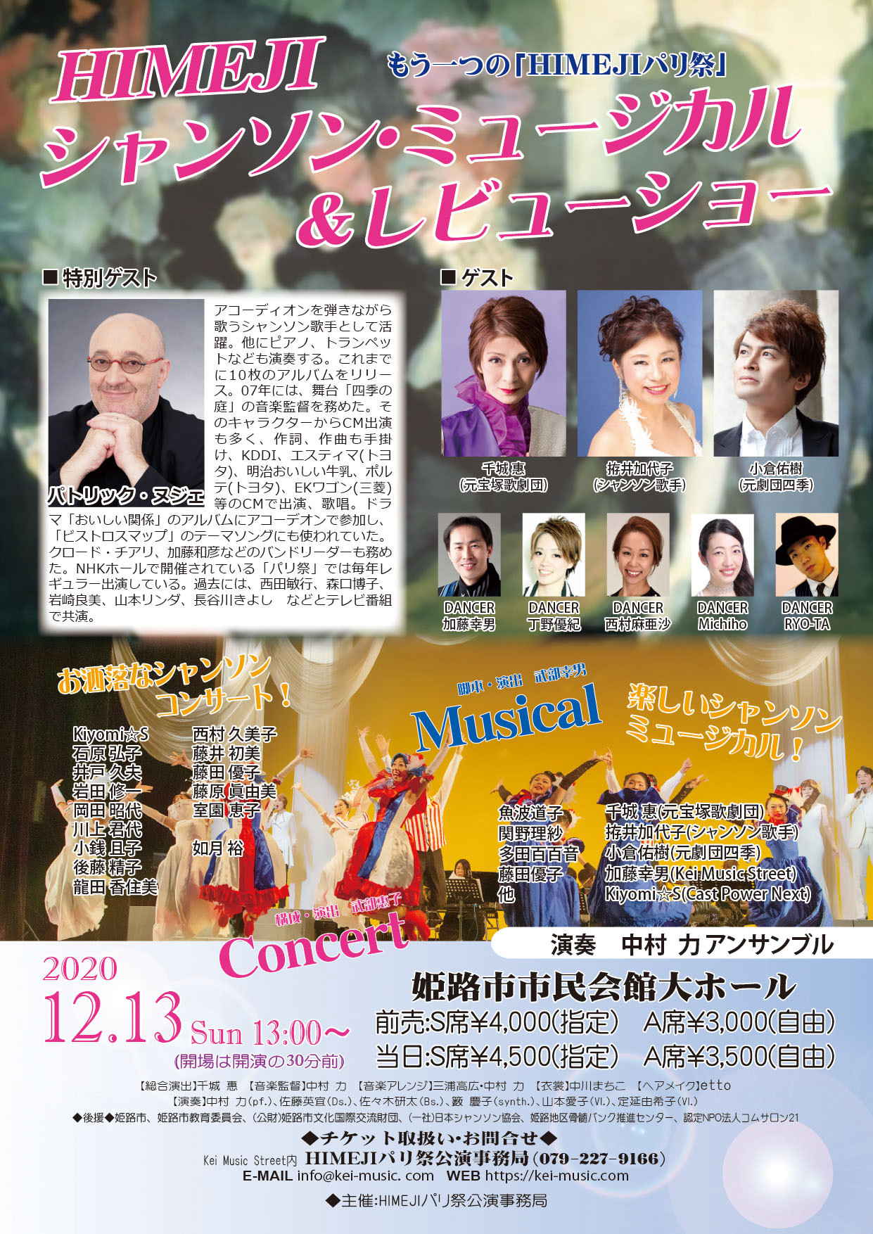 コロナの影響で今年の7月開催予定だった毎年恒例のHIMEJIパリ祭が中止になってしまいました。それでも何とか準備して、スケジュールを無理矢理調整して、2年に一度のスタジオ全体発表会のために会場を確保していた事も考慮して、この度12/13(日)姫路市市民会館大ホールで改めて「HIMEJIパリ祭2020」…ではなく、「HIMEJIシャンソン・ミュージカル&レビューショー」を開催することになりました。