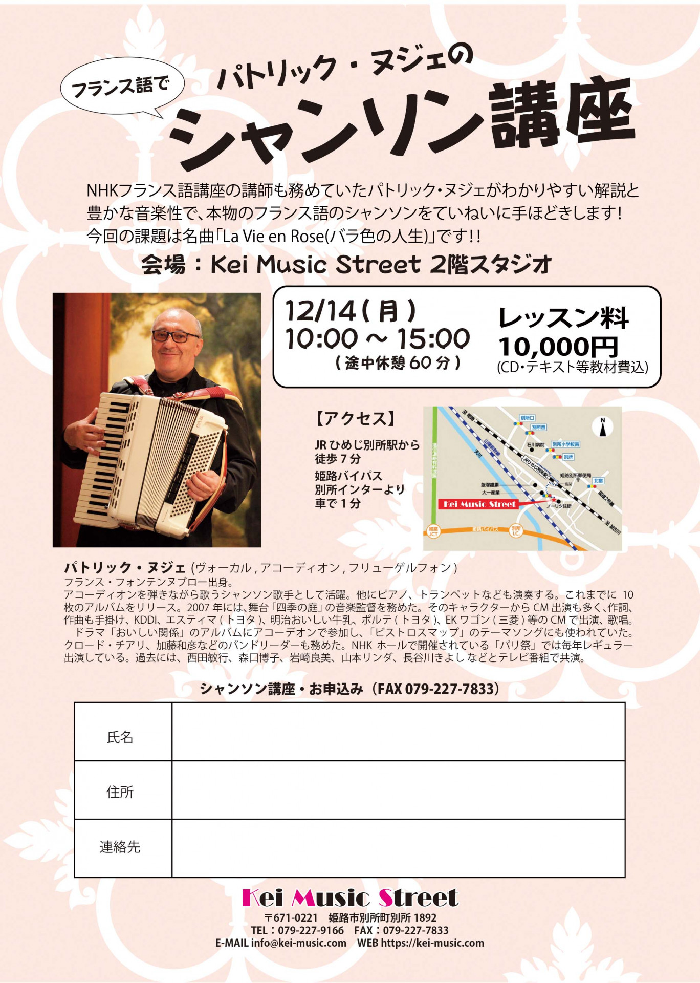 そして、公演翌日にはネイティブなフランス語でシャンソンを歌うパトリック・ヌジェさんの「シャンソン講座」もあります。本格的なシャンソンを勉強する絶好の機会です!
