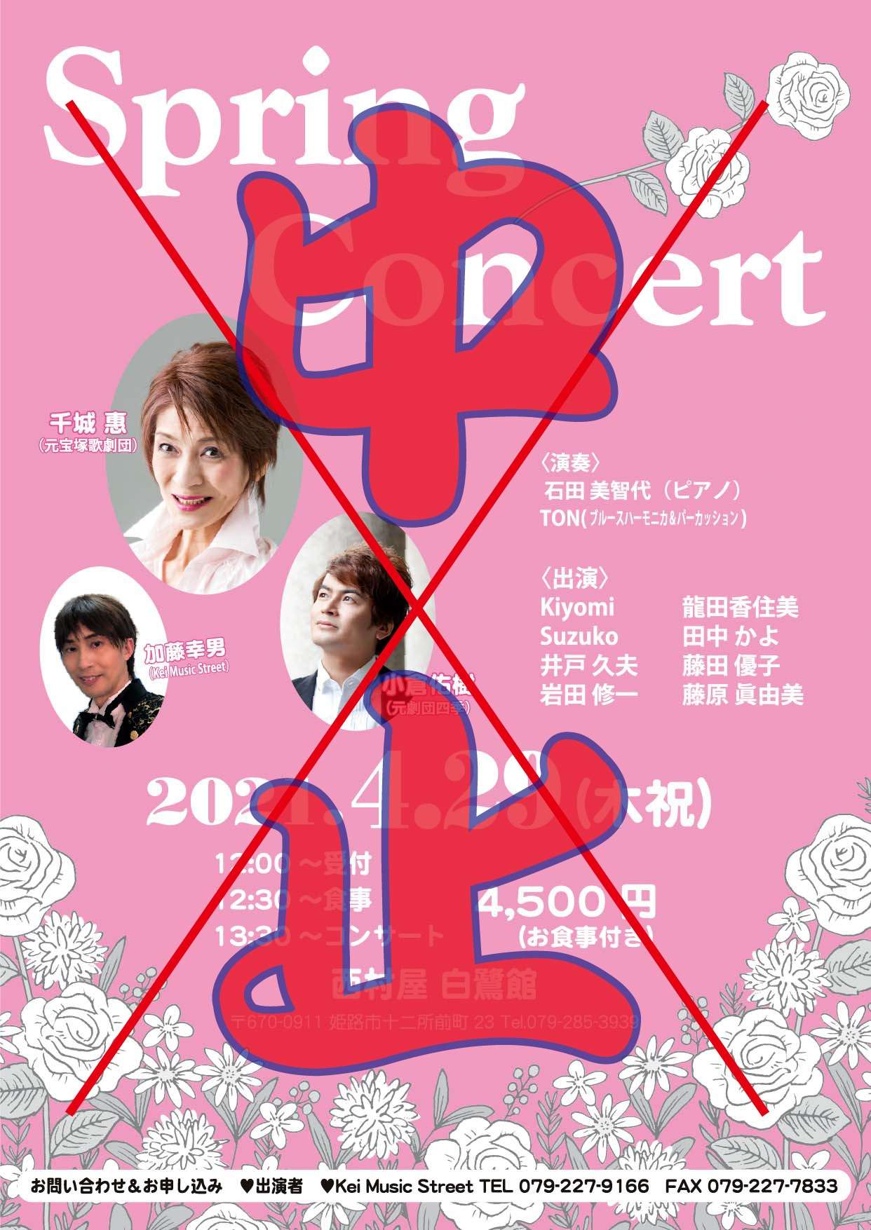 【2021.4.25】Spring Concert 公演中止! 2021/04/25 姫路のシャンソン コンサートはKei Music Street 誠に残念ながら、4/29(木祝)に西村屋白鷺館で予定していたSpring Concertは緊急事態宣言等のコロナの状況を鑑みて中止することになりました。 せっかく準備練習してきた曲目や企画なので、また秋頃に同じメンバーで「お洒落にシャンソン」シリーズとしてリベンジ公演したいと思います! 既にチケット購入されている方は返金対応致しますのでKei Music Street(079-227-9166)までご一報ください。 イベント